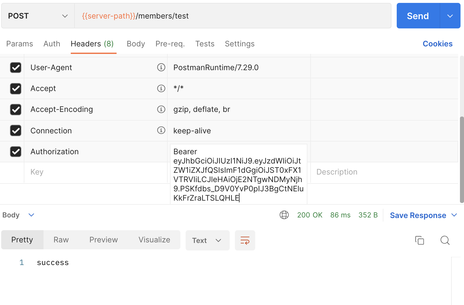 이 때, Access Token을 Authorization 헤더에 "Bearer [Access Token]" 형태로 추가한다.
